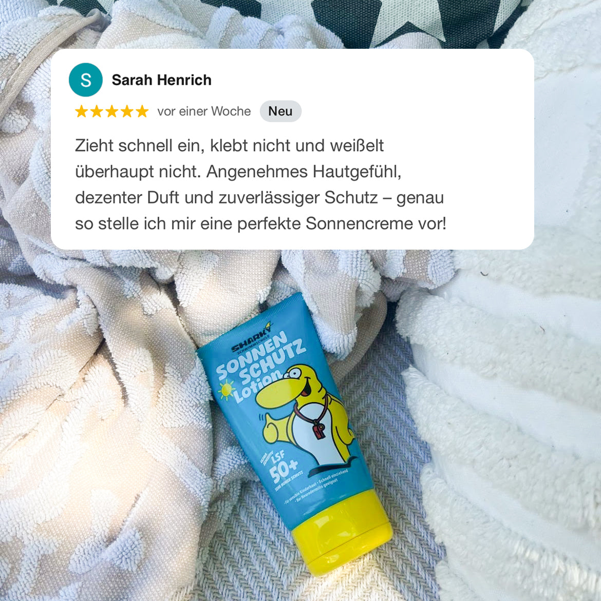 Sehr hochwertiges Produkt. Zieht super schnell ein und ist Geruchsneutral. Super hautverträglich. Hat mich echt sehr positiv überrascht. Würde es jederzeit wieder kaufen. Kinder lieben die Verpackung mit Sharky.